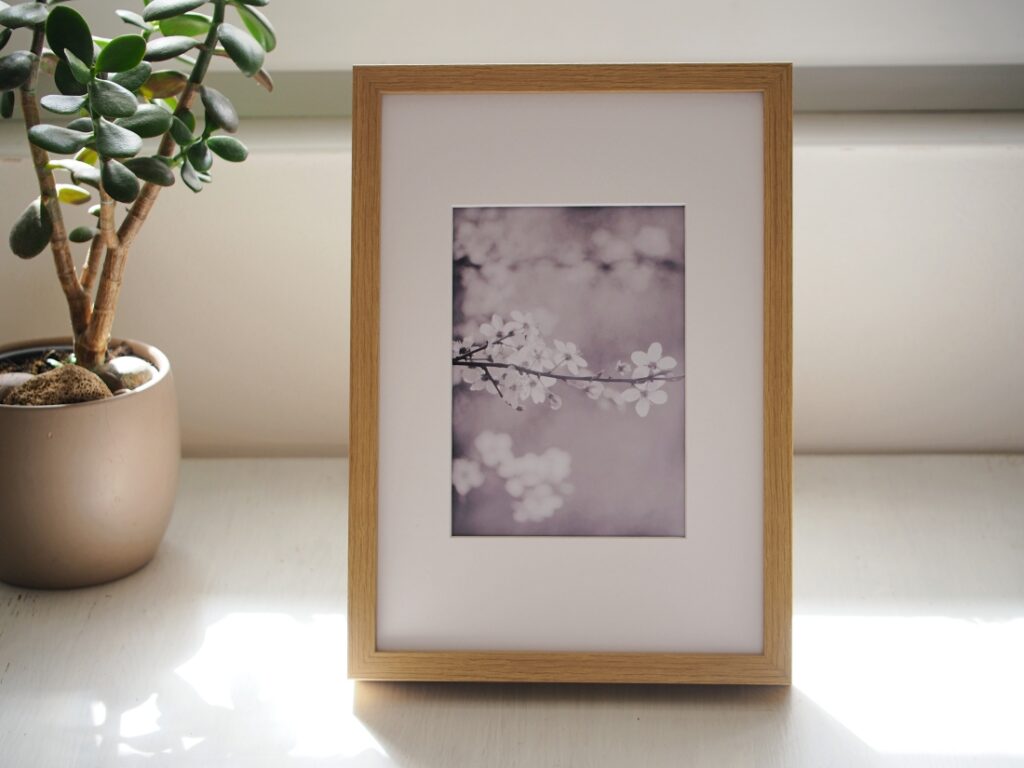 Jemná fotografie rozkvetlé jarní větvičky v měkkém světle, v rámu s paspartou.